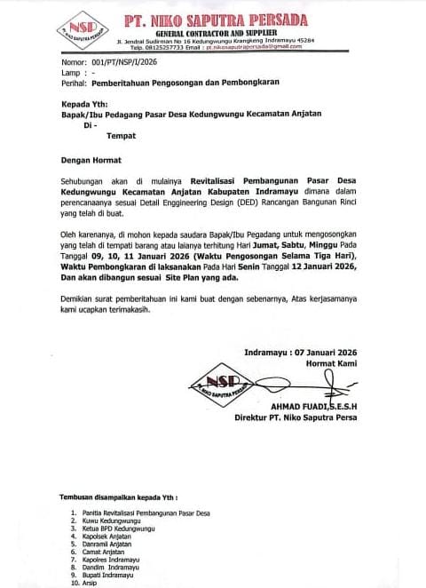 Surat pemberitahuan dengan nomor 001/PT/NSP/2026 yang diterbitkan oleh PT Niko Saputra Persada (NSP) memerintahkan pedagang untuk mengosongkan kios dalam waktu tiga hari terhitung Jumat hingga Minggu (9–11/1/2026) sebelum pembongkaran dilakukan pada 12 Januari 2026. Surat tersebut menuai reaksi keras lantaran dinilai tidak mengindahkan aspek legal dan sosial di lapangan.